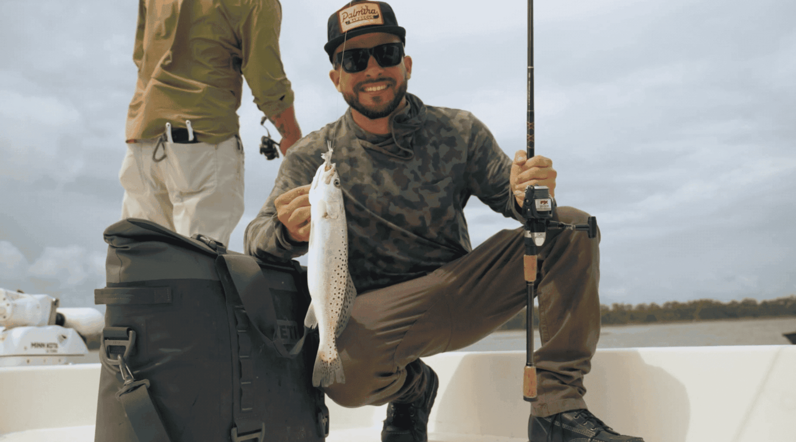 Speckled trout are pulled from seam lines using popping corks that mimic shrimp — a visual and auditory trigger for trout feeding in shallow marsh water. As the tide rises and oyster beds submerge, the group adapts, moving locations instead of forcing a bite.
