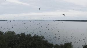 At peak moments, Bomb Island may host up to 10% of the global purple martin population — an astonishing concentration for a single location.